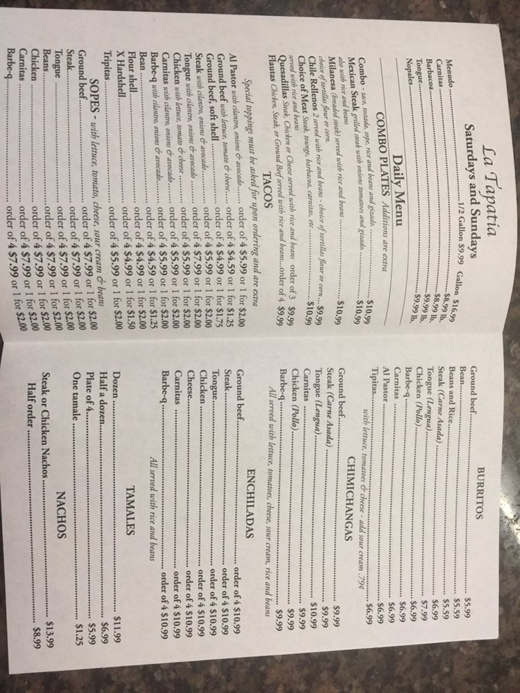 La Tapatia, a Mexican restaurant located in Racine, WI, offers a wide range of dishes with many vegetarian options. The menu includes traditional Mexican soups like Menudo and Pozole, as well as Mexican plates such as Flautas and Carne Asada. The Combo Plates, like Platos Combinados, provide a variety of options to choose from. La Tapatia also offers delivery, takeout, and catering services, making it a convenient choice for any occasion. With a lively atmosphere and outdoor seating available, it's a great spot for groups or families. The authentic flavors and generous portions make dining at La Tapatia a satisfying experience.